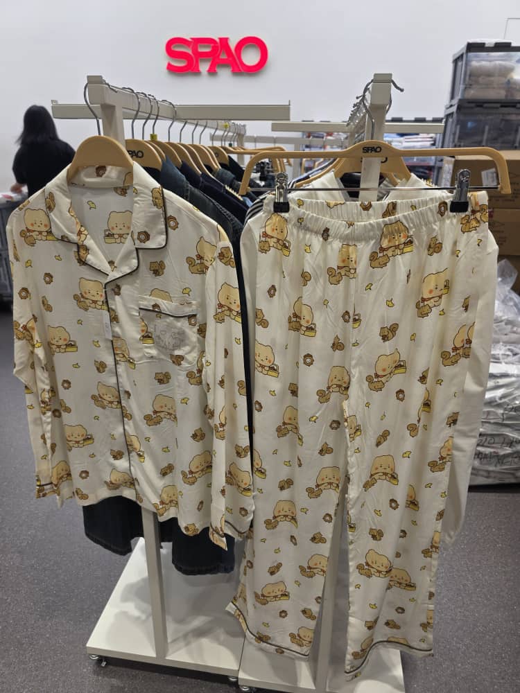 This adorable pajama set features a playful cartoon print, perfect for adding a touch of whimsy to your sleepwear collection. The set includes a long-sleeved button-down top and matching pants, both made from a soft, lightweight fabric that ensures a comfortable night's sleep. The charming cartoon design consists of a repeating pattern of a cute character holding a burger, interspersed with small floral accents. The pajamas have a light cream or off-white base color, providing a gentle backdrop for the delightful print. The top is designed with a notched collar and a chest pocket, both trimmed with a contrasting dark brown piping that adds a refined touch. The pants have an elastic waistband for a flexible and comfortable fit. The overall design is both fun and stylish, making it a great choice for lounging around the house or enjoying a restful night's sleep. This pajama set is ideal for anyone who loves cute and comfortable sleepwear. It would be a perfect gift for teens, young adults, or anyone who appreciates a touch of playful charm in their wardrobe. The set is also suitable for those who value comfort and quality in their sleepwear, as the soft fabric and relaxed fit ensure a pleasant wearing experience. The set is displayed on a hanger, suggesting it is part of a retail collection. The SPAO brand logo is visible in the background, indicating the brand and origin of the product. Key Features: * Soft, lightweight fabric for ultimate comfort * Charming cartoon print with cute character and floral accents * Long-sleeved button-down top with notched collar and chest pocket * Matching pants with elastic waistband * Contrasting dark brown piping for a stylish touch * Relaxed fit for easy movement and lounging * Ideal for teens, young adults, and anyone who loves cute sleepwear