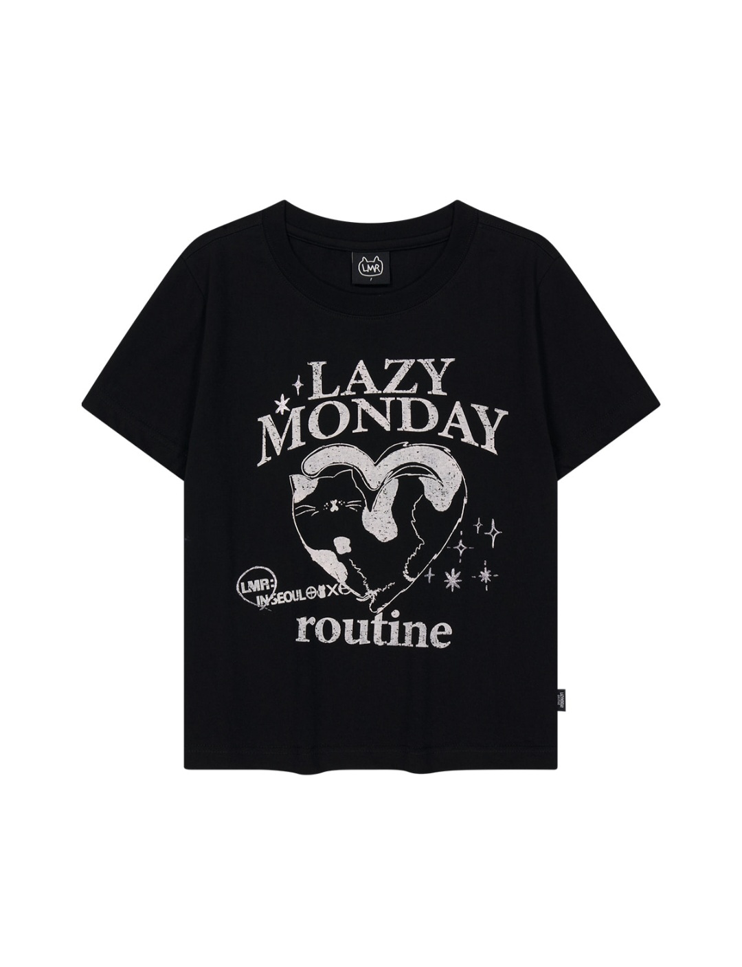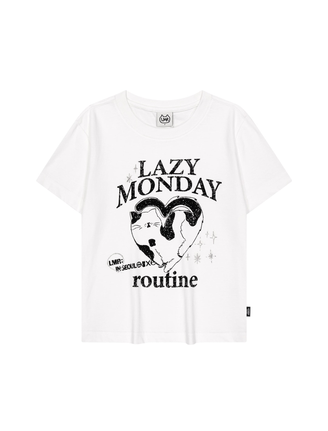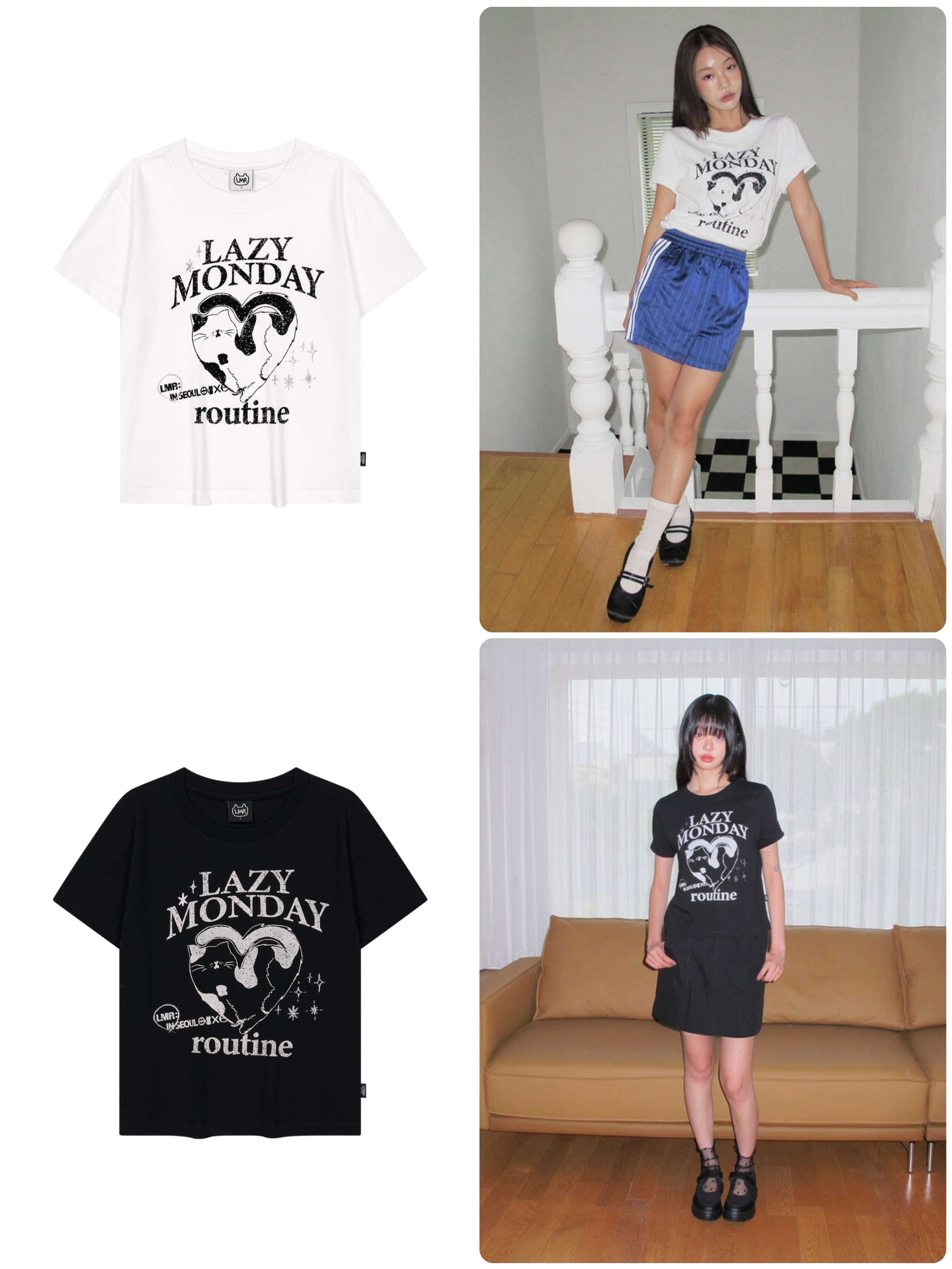 This Lazy Monday graphic print t-shirt is a stylish and comfortable choice for everyday wear. Available in black and white, this t-shirt features a unique graphic print with the words "Lazy Monday" and an image of cats forming a heart. The print also includes the words "routine" and "LM: IN SEOUL XE". This t-shirt is perfect for anyone who wants to add a touch of personality to their wardrobe. It can be dressed up or down, making it a versatile piece for any occasion. Whether you're running errands, meeting friends for coffee, or just relaxing at home, this t-shirt is sure to keep you comfortable and stylish. Features: - Available in black and white - Unique graphic print - Comfortable fit - Versatile style - Short sleeves - Round neck Benefits: - Express your personal style - Stay comfortable all day long - Dress it up or down for any occasion - Make a statement with a unique graphic print - Easy to care for This t-shirt is perfect for: - Anyone who loves cats - People who want to express their personal style - Those who appreciate comfortable and stylish clothing - Anyone looking for a versatile piece to add to their wardrobe