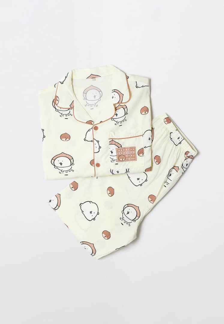 This adorable pajama set is perfect for lounging around the house or getting a good night's sleep. The set includes a long-sleeved button-down top and matching pants, both made from a soft, lightweight fabric. The pajamas feature a charming cartoon print of a cute character and chestnuts, adding a touch of whimsy to your bedtime routine. The top has a notched collar, button-down closure, and a chest pocket, while the pants have an elastic waistband for a comfortable fit. The piping along the edges adds a touch of sophistication to the overall design. These pajamas are perfect for women of all ages who love cute and comfortable sleepwear. They would also make a great gift for birthdays, holidays, or any special occasion. Key Features and Benefits: * Soft and comfortable fabric * Cute cartoon print * Long-sleeved top and pants * Button-down closure on top * Elastic waistband on pants * Chest pocket on top * Piping along the edges * Lightweight and breathable * Perfect for lounging or sleeping * Great gift idea