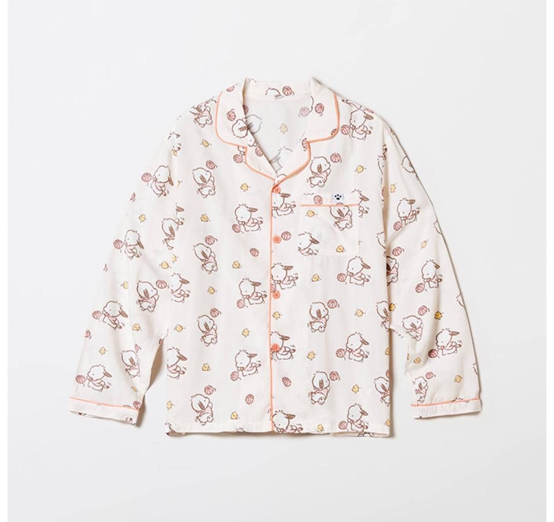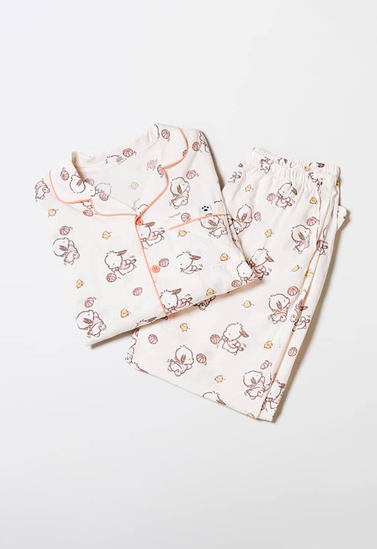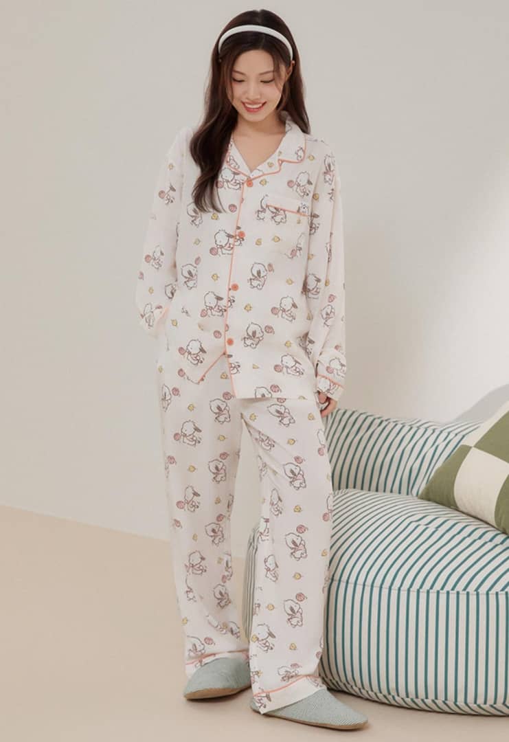 This adorable SPAO pajama set features a playful character print, perfect for adding a touch of fun to your sleepwear collection. The set includes a long-sleeved, button-down top and matching long pants, both made from a lightweight fabric that ensures comfort throughout the night. The light-colored material is adorned with a repeating pattern of a cartoon character playing with a basketball, creating a whimsical and cheerful design. The top is designed with a notched collar, button-up closure, and a chest pocket, while the pants have an elastic waistband for a flexible and comfortable fit. The edges of the pajamas are trimmed with a contrasting color, adding a subtle pop of color to the overall design. This pajama set is ideal for those who appreciate cute and comfortable loungewear, and it makes a great gift for friends and family who love unique and playful designs. Whether you're relaxing at home or getting ready for bed, this SPAO pajama set will keep you cozy and stylish. Key Features: * Matching long-sleeved top and long pants * Lightweight and comfortable fabric * Playful character print with basketball theme * Button-down top with notched collar and chest pocket * Elastic waistband for a flexible fit * Contrasting color trim * Suitable for all ages who enjoy fun and comfortable sleepwear