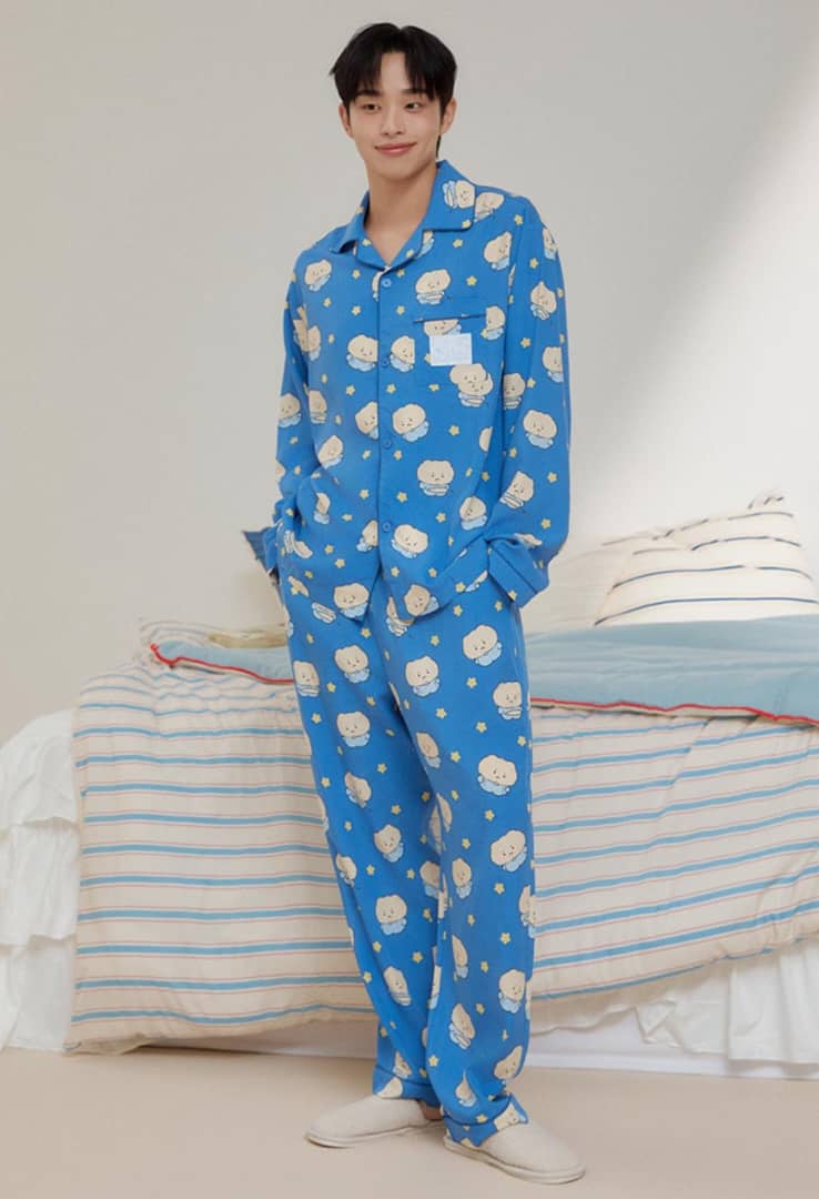 Indulge in comfort and cuteness with this adorable cartoon pajama set. This two-piece sleepwear ensemble features a long-sleeved top and matching pants, both adorned with a charming cartoon character and star pattern on a blue background. The top is designed with a notched collar and button-down front, offering a classic pajama look with a touch of whimsy. A small patch is sewn on the top. The pants have an elastic waistband for a flexible and comfortable fit, ensuring a restful night's sleep. The fabric appears soft and lightweight, perfect for year-round wear. This pajama set is ideal for anyone who loves fun, playful sleepwear. It's a great choice for teens, young adults, or anyone who enjoys expressing their personality through their loungewear. Whether you're relaxing at home, enjoying a lazy weekend morning, or getting ready for bed, this pajama set will keep you cozy and stylish. Key Features: * Two-piece pajama set including a long-sleeved top and pants * Charming cartoon character and star pattern * Classic notched collar and button-down top * Comfortable elastic waistband on pants * Soft and lightweight fabric * Suitable for year-round wear * Perfect for lounging and sleeping * Available in various sizes