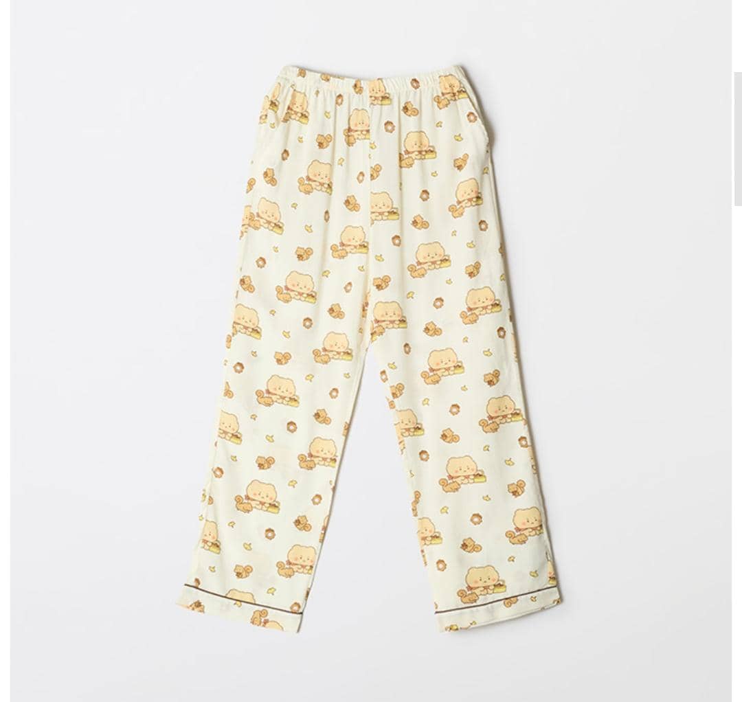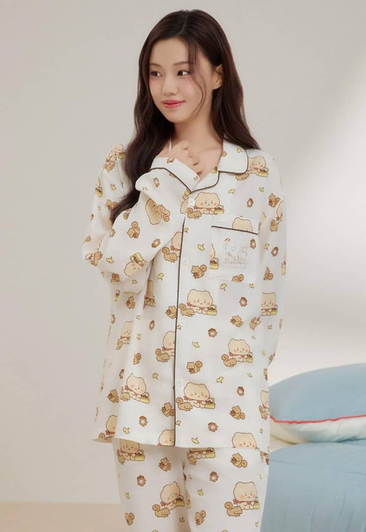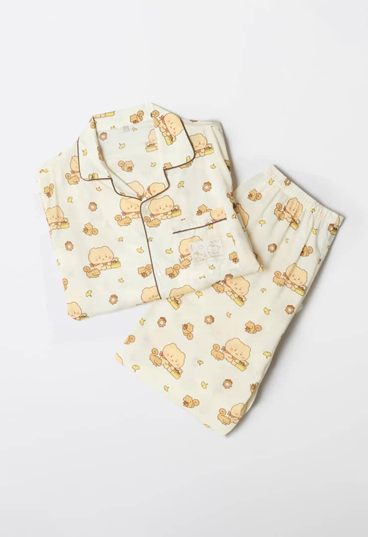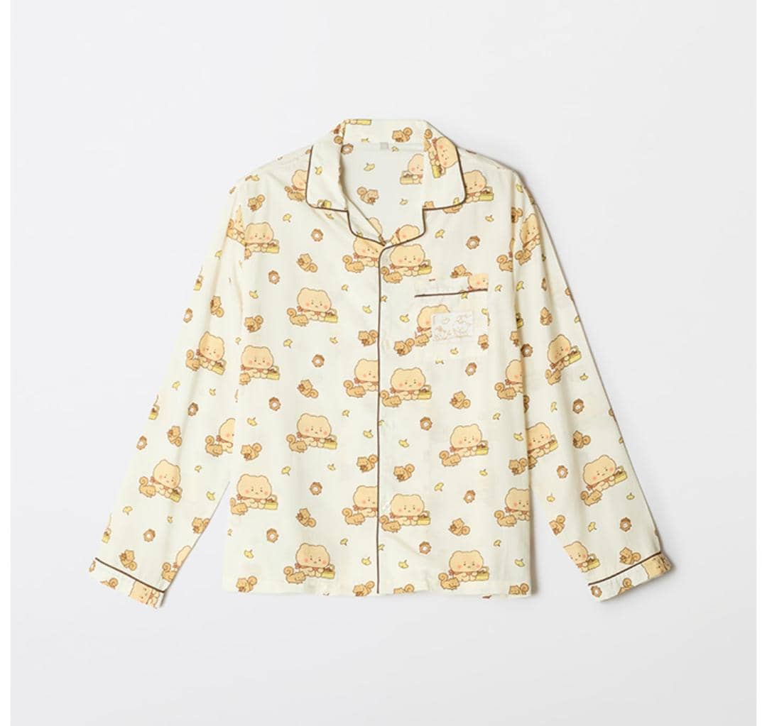 This adorable pajama set features a playful cartoon design, perfect for adding a touch of whimsy to your sleepwear collection. The set includes a long-sleeved, button-down top and matching pants, both adorned with a charming cartoon pattern. The light-colored fabric provides a soft and comfortable feel against the skin, ensuring a restful night's sleep. The top features a notched collar and a chest pocket, both trimmed with a contrasting dark piping that adds a stylish touch. The pants have an elastic waistband for a flexible and comfortable fit. The overall design is both cute and practical, making it an excellent choice for lounging at home or enjoying a peaceful night's sleep. The set is ideal for those who appreciate fun and playful designs in their sleepwear. The lightweight fabric makes it suitable for year-round wear, providing comfort without being too heavy. The button-down top allows for easy wear and removal, while the elastic waistband ensures a snug yet comfortable fit. The cartoon pattern is sure to bring a smile to your face, making bedtime a little more enjoyable. This pajama set is perfect for anyone looking to add a bit of fun and comfort to their nighttime routine. Key Features: * Charming cartoon pattern * Soft and comfortable fabric * Long-sleeved, button-down top * Matching pants with elastic waistband * Contrasting dark piping trim * Chest pocket on the top * Lightweight and breathable material * Suitable for year-round wear * Easy to wear and remove * Perfect for lounging and sleeping