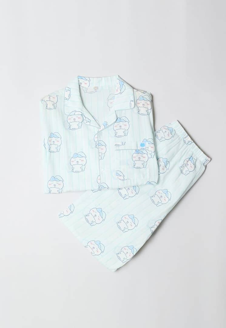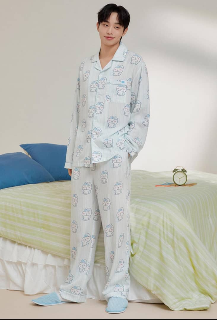 This adorable pajama set features a light blue background with vertical stripes and a cute cartoon character print. The top is a button-down style with a notched collar, long sleeves, and a chest pocket. The matching bottoms have a comfortable elastic waistband. This pajama set is perfect for lounging around the house or getting a good night's sleep. The soft and breathable fabric will keep you comfortable all night long. The cute cartoon print adds a touch of fun and whimsy to your bedtime routine. This pajama set is perfect for anyone who loves cute and comfortable sleepwear. It's also a great gift idea for friends and family. The set is available in a variety of sizes to ensure a perfect fit. The light blue color is calming and relaxing, making it the perfect choice for bedtime. The vertical stripes add a touch of style and sophistication. The chest pocket is perfect for holding small items like your phone or glasses. The long sleeves will keep you warm on chilly nights. The elastic waistband is comfortable and won't dig into your skin. The soft and breathable fabric is gentle on your skin and won't cause irritation. This pajama set is machine washable and easy to care for. It's a great value for the price. Order yours today and start enjoying a more comfortable and stylish bedtime routine! Key features and benefits: - Cute cartoon character print - Soft and breathable fabric - Comfortable elastic waistband - Button-down top with notched collar - Long sleeves - Chest pocket - Machine washable - Available in a variety of sizes