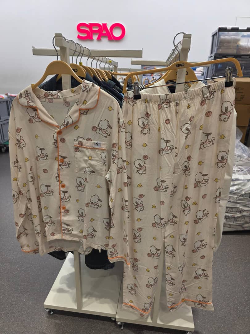 This adorable SPAO pajama set features a playful character print, perfect for adding a touch of fun to your sleepwear collection. The set includes a long-sleeved, button-down top and matching long pants, both made from a lightweight fabric that ensures comfort throughout the night. The light-colored material is adorned with a repeating pattern of a cartoon character playing with a basketball, creating a whimsical and cheerful design. The top is designed with a notched collar, button-up closure, and a chest pocket, while the pants have an elastic waistband for a flexible and comfortable fit. The edges of the pajamas are trimmed with a contrasting color, adding a subtle pop of color to the overall design. This pajama set is ideal for those who appreciate cute and comfortable loungewear, and it makes a great gift for friends and family who love unique and playful designs. Whether you're relaxing at home or getting ready for bed, this SPAO pajama set will keep you cozy and stylish. Key Features: * Matching long-sleeved top and long pants * Lightweight and comfortable fabric * Playful character print with basketball theme * Button-down top with notched collar and chest pocket * Elastic waistband for a flexible fit * Contrasting color trim * Suitable for all ages who enjoy fun and comfortable sleepwear