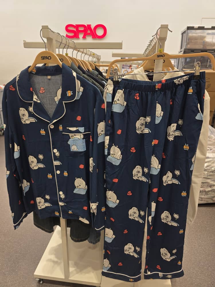This SPAO pajama set features a charming bear print on a navy blue background. The set includes a long-sleeved, button-down top and matching pajama pants, both adorned with a playful pattern of bears, clocks, and building blocks. The top has a notched collar and a chest pocket, while the pants have an elastic waistband for a comfortable fit. White piping accents the edges of the collar, cuffs, pocket, front closure, and hem of the pants, adding a touch of contrast to the design. The pajamas are displayed on hangers, suggesting they are ready for retail. The SPAO logo is visible on the hangers and in the background, indicating the brand. This pajama set is perfect for those who appreciate cute and comfortable sleepwear. Key Features: * Matching pajama set with a bear print * Long-sleeved, button-down top with chest pocket * Pajama pants with elastic waistband * White piping accents on collar, cuffs, and hem * Comfortable and stylish sleepwear * Suitable for lounging and sleeping * Ideal for bear and cartoon lovers * Perfect for a cozy night in
