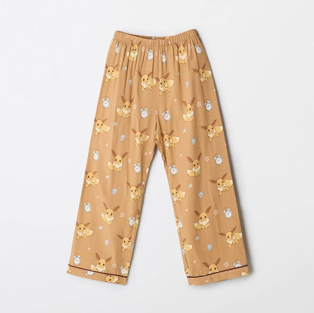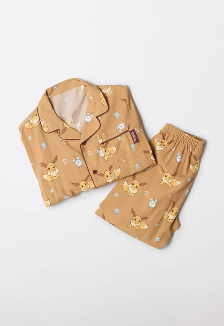 Get ready for a cozy night's sleep with this adorable Eevee pajama set from SPAO. This set includes a long-sleeved, button-down top and matching pants, both featuring an all-over print of the beloved Pokémon, Eevee, along with stars and clocks. The pajamas are made from a soft, lightweight fabric, perfect for year-round comfort. The top has a classic collar and button-up front, while the pants have an elastic waistband for a snug and adjustable fit. The brown color palette adds a touch of warmth and whimsy to your sleepwear collection. The SPAO brand is subtly displayed on the hangers. This pajama set is perfect for: * Pokémon enthusiasts * Anyone who loves cute and comfortable sleepwear * Those looking for a unique and playful pajama set Key Features: * All-over Eevee print * Soft and lightweight fabric * Long-sleeved, button-down top * Elastic waistband pants * Classic collar * Comfortable fit
