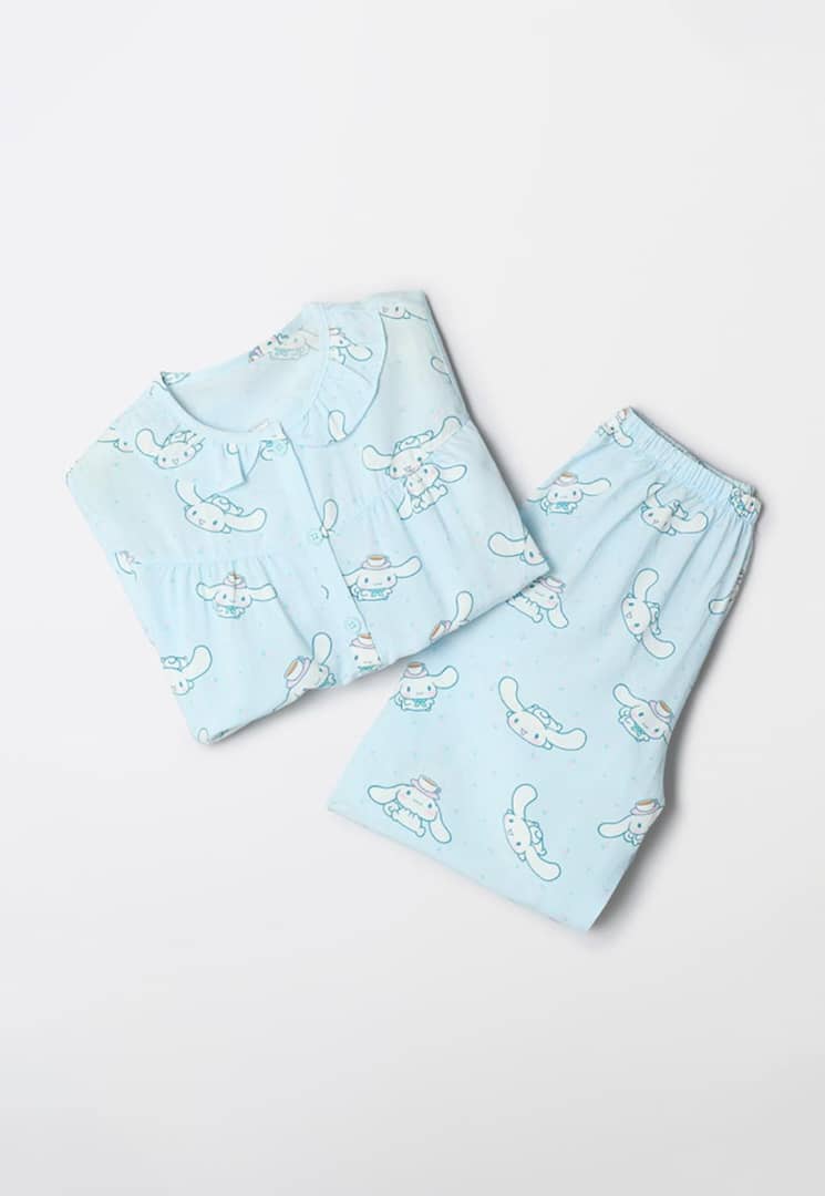 Indulge in sweet dreams with this charming Cinnamoroll pajama set. This delightful sleepwear ensemble features a long-sleeved top and matching pants, both adorned with an all-over print of the beloved Sanrio character, Cinnamoroll. The light blue color palette adds a touch of serenity, making it the perfect choice for a restful night's sleep or lounging around the house in style. The top is designed with a classic button-down front and a sweet, ruffled collar, adding a touch of feminine charm. The long sleeves provide warmth and coverage, while the lightweight fabric ensures breathability and comfort. The pants feature an elastic waistband for a snug and adjustable fit, and the ruffled hem adds a playful detail. This pajama set is perfect for Cinnamoroll fans of all ages, or anyone who appreciates cute and comfortable sleepwear. Whether you're treating yourself or looking for a thoughtful gift, this Cinnamoroll pajama set is sure to bring joy and relaxation to your bedtime routine. Key Features: - Adorable Cinnamoroll print - Soft and comfortable fabric - Long-sleeved top with button-down front - Ruffled collar and hem details - Elastic waistband for a comfortable fit - Light blue color palette - Perfect for lounging and sleeping - Ideal gift for Sanrio fans