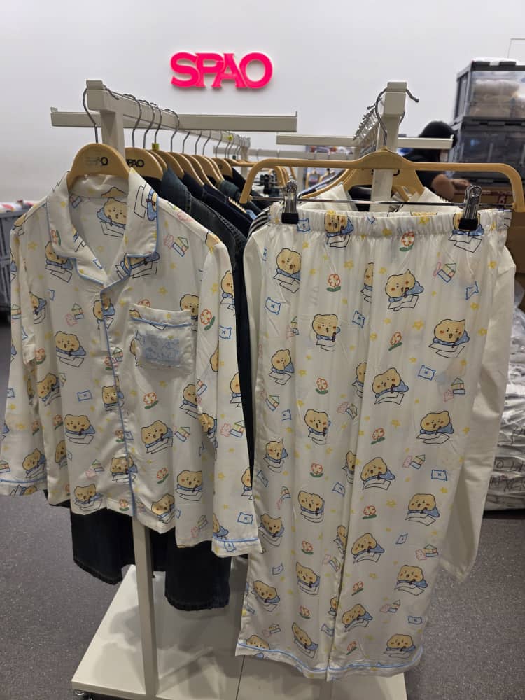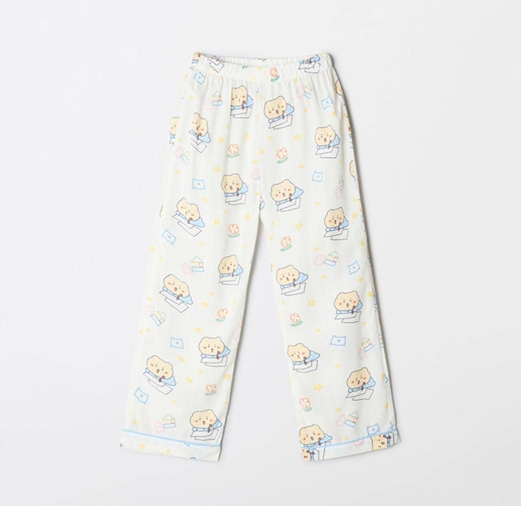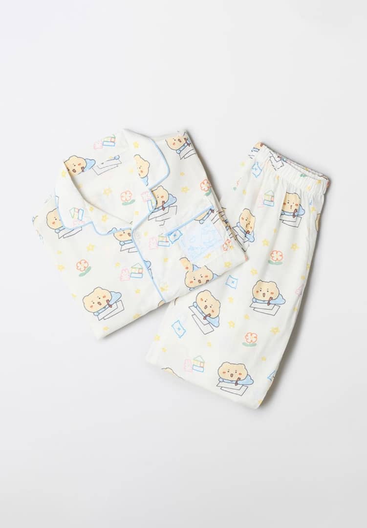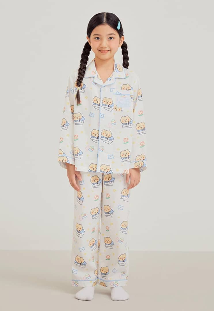 This adorable pajama set is perfect for adding a touch of whimsy to your sleepwear collection. The set includes a long-sleeved button-down top and matching pants, both made from a soft, lightweight fabric for ultimate comfort. The charming cartoon print features a repeating pattern of a bear-like character sitting on a book, along with other cute motifs like flowers and envelopes. The white background is accented with light blue piping around the collar, cuffs, and pocket, adding a subtle pop of color. The pants have an elastic waistband for a flexible and comfortable fit. This pajama set is ideal for lounging around the house or getting a good night's sleep. It would make a delightful gift for anyone who loves cute and comfortable sleepwear. The set is displayed on a hanger, showcasing its full design and fit. The fabric appears to be breathable and easy to care for, making it a practical choice for everyday wear. The overall design is both playful and stylish, suitable for women of all ages who appreciate a fun and comfortable pajama set. The light colors and cheerful print make it a great choice for warmer weather, while the long sleeves and pants provide enough coverage for cooler nights. This pajama set is a must-have for anyone looking to add a touch of cuteness to their bedtime routine. Key features and benefits: * Soft and lightweight fabric for ultimate comfort * Charming cartoon print with bear-like characters, flowers, and envelopes * Long-sleeved button-down top and matching pants * Light blue piping accents for a subtle pop of color * Elastic waistband for a flexible and comfortable fit * Breathable and easy-to-care-for fabric * Playful and stylish design suitable for all ages * Ideal for lounging or sleeping * Great gift idea for pajama lovers