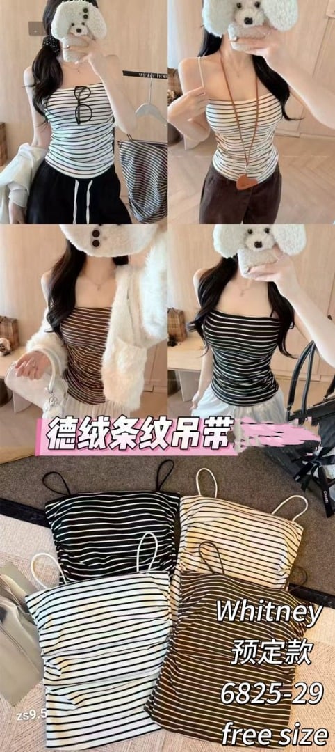 This striped spaghetti strap tube top is a stylish and versatile piece that can be dressed up or down. The top features a classic striped pattern and thin spaghetti straps. The tube top design is perfect for showing off your shoulders and back, while the fitted silhouette flatters your figure. This top is made from a soft and stretchy fabric that is comfortable to wear all day long. It is available in a variety of colors, including black, brown, and white. The top is labeled with the brand name "Whitney" and the style number "6825-29". It is also labeled as "free size". This top is perfect for a variety of occasions, from casual outings to dressy events. Pair it with jeans or shorts for a casual look, or dress it up with a skirt or pants for a more formal occasion. This top is also a great layering piece. Wear it under a jacket or cardigan for extra warmth. Features: - Classic striped pattern - Thin spaghetti straps - Tube top design - Fitted silhouette - Soft and stretchy fabric - Available in a variety of colors - Brand name "Whitney" - Style number "6825-29" - Free size Benefits: - Stylish and versatile - Comfortable to wear - Flattering fit - Perfect for a variety of occasions - Great layering piece This top is perfect for women who want a stylish and versatile piece that can be dressed up or down. It is also a great choice for women who want a comfortable and flattering top.